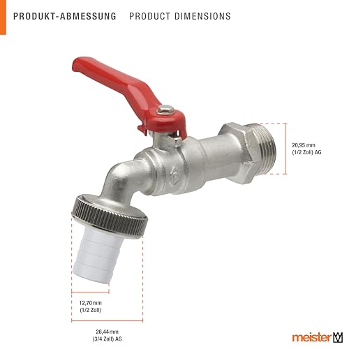 Meister kogelkraan, inclusief slangaansluiting, hoogwaardig messing, ideaal als buitenappel, tapkraan voor regenton/kraan 20,95 mm (1/2 inch) AG rood