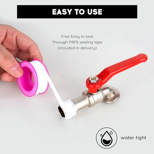 RUCUDIM Universele waterkraan voor de tuin, 1/2 inch en 3/4 inch, vorstbestendige afvoerkraan met 2 gratis slangaansluitingen + 1 rolafdichtband voor tuin, waterkraan, aftapkraan, regenton (rood)