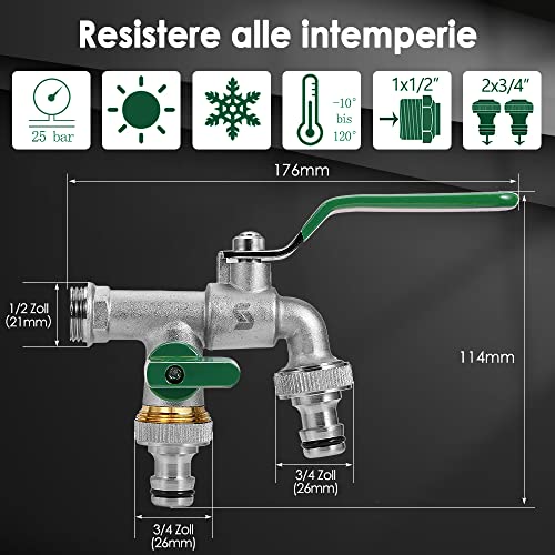 SPGOOD Premium Tuinkraan, 1/2 Dubbele Messing Kraan Roest- en hittebestendig + met 2 Slangaansluitingen + 1x Trommelafdichtingstape, Dubbel Gewricht en Slangtule Voor Tuin (groente)