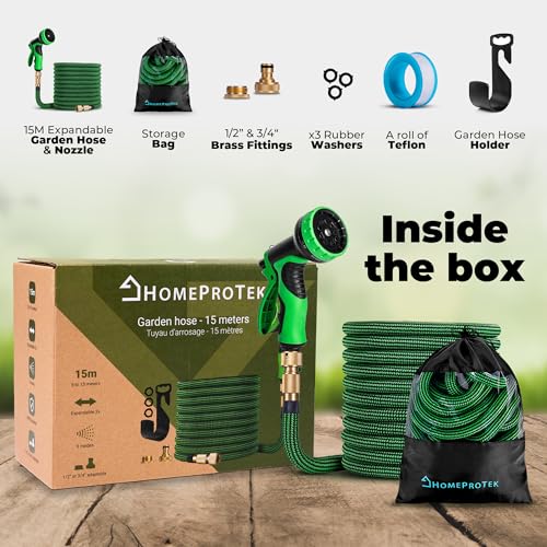 HOMEPROTEK Flexibele tuinslang, 15 m, waterslang, rekbare flexibele slang met 1/2 inch en 3/4 inch messing schroefkoppelingen, 3-voudige latex balkonslang