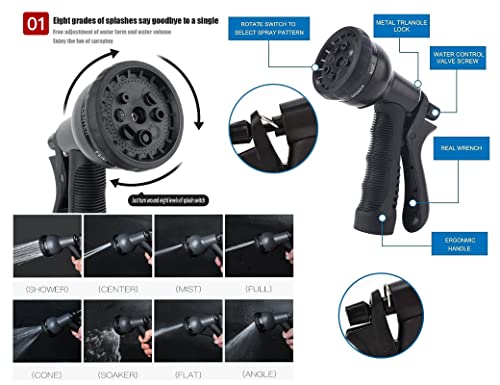7 instelbare spuitpistoolmodi: inclusief mist, spray, douche, dompelniveau, medium, kegel, vol, selecteer de beste modus die nodig is. Je kunt indien nodig eenvoudig van modus wisselen, geschikt voor het besproeien van gazons, planten of struiken, het wassen van auto’s, het schoonmaken van huizen, badhonden, enz