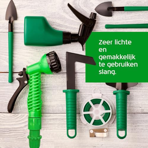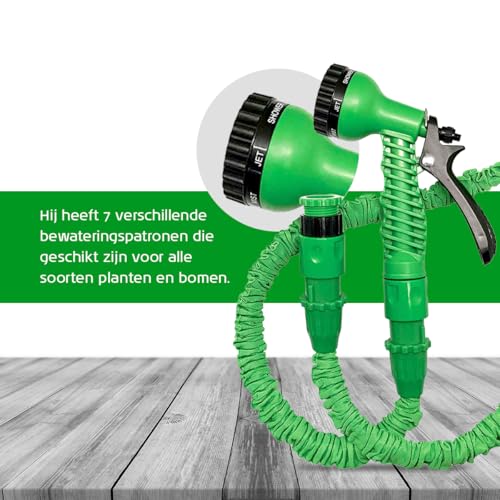 Uitschuifbare tuinslang in groene kleur, zeer licht en eenvoudig in gebruik, inclusief 2 snelaansluitingen en kraanadapters