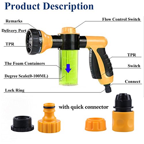 ✔ SPECIALE ONTWERPEN: Kan worden geschakeld tussen schuim en waterspoelen. Ontworpen met schuimopslag, kan zeep of kunstmest mengen, 3-weg schuimstroomregelschakelaar modus. Met GRATIS 2 snelle vrouwelijke connectoren naar 3/4 schroefdraad pijp en met rubberen set.