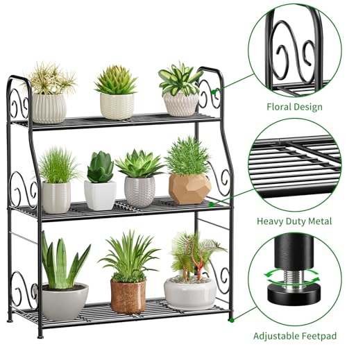 3-laags plantenstandaard: het plantenrek met grote capaciteit kan meer ruimte bieden om uw favoriete bloemen, groen, vetplanten weer te geven, het is breed genoeg om rechthoekige plantenbakken te huisvesten, gelaagd draadontwerp laat voldoende zonlicht toe om de planten te bereiken.