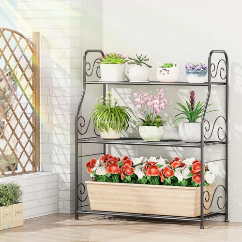 Ovicar Metalen plantenstandaardrek – 3-laags indoor outdoor plantendisplay plank bloempothouder voor tuin terras balkon veranda hoek woonkamer, meerdere opbergplank voor thuisgebruik (zwart)