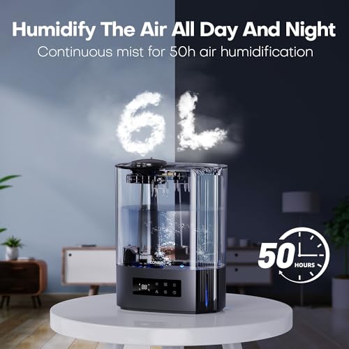 [Capaciteit watertank van 6 liter] luchtbevochtiger 6L watertank met grote capaciteit, kan tot 60 uur continu worden gebruikt als deze eenmaal met water is gevuld, en de handgreep van het waterreservoir in de luchtbevochtiger is ook handig om water toe te voegen