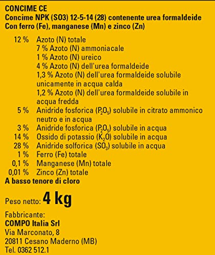 Universele minerale meststof granulaat met langzame stikstof voor alle tuin-, fruit- en sierculturen, zowel in de pot als in volle aarde, langdurige voeding tot 3 maanden NPK-meststof (S03) 12-5-14 (28) met formaldehyde-ureum, met ijzer (fe), mangaan (Mn) en zink (zink), bevat voedingsstoffen om toe te voegen. brengt kracht, balans en Kwaliteit – Gebruiksduur: februari tot oktober zorgvuldig lezen – Gebruikswijze: meststof over de grond verdelen, graven met hark en gieten – Inhoud: 1 verpakking COMPO NPK gouden meststof universele meststof gewicht: 4 kg, art. Nummer: