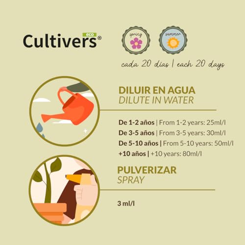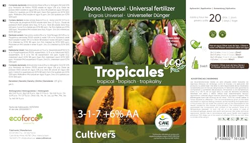 Speciale vloeibare ecologische meststof voor tropische planten voor avocado, mango, lychee, pitahaya, papaya en guave NPK 3-1-7 oplossing De gecombineerde toevoer van macronutrienten (stikstof, fosfor en kalium) en micronutrienten (boor, calcium, ijzer, mangaan, molybdeen en zink) zorgt voor een completere en evenwichtigere voeding Aminozuren bevorderen de assimilatie van de elementen en geven het een biostimulerende werking Het vergemakkelijkt de ontwikkeling van de plant in stresssituaties, waardoor een beter herstel van de planten mogelijk is 100% natuurlijk en onschadelijk voor dieren, mili