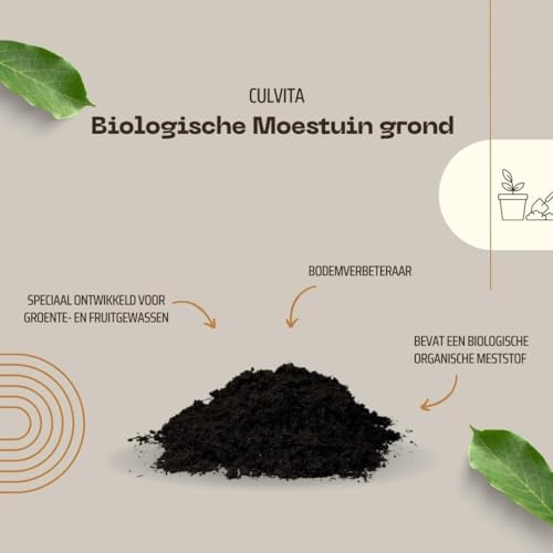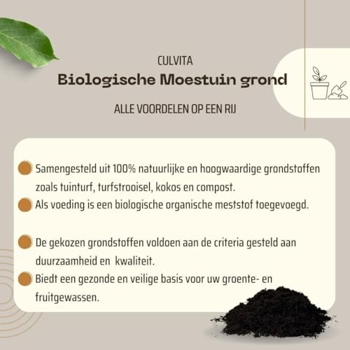 Culvita Bio-Moestuingrond biedt een gezonde en veilige basis voor uw groente- en fruitgewassen. Toepassing Culvita Bio-Moestuingrond is ontwikkeld als groeimedium in de groente- of moestuin en voor het vullen van potten en bakken. Het kan ook worden gebruikt als bodemverbeteraar in bestaande of nieuw aan te leggen tuinen . Het is zeer geschikt om veilig te worden toegepast bij het kweken van groenten, kruiden en klein-fruitsoorten in de kas, tuin, op het balkon of terras. Voor gebruik de inhoud van de zak goed los maken. Culvita Bio-Moestuingrond bevat een biologische organische meststof voor ca. 3 maanden. Eigenschappen Culvita Bio-Moestuingrond is samengesteld uit 100% natuurlijke en hoogwaardige grondstoffen zoals tuinturf, turfstrooisel, kokos en compost. Als voeding is een biologische organische meststof toegevoegd. De gekozen grondstoffen voldoen aan de criteria gesteld aan duurzaamheid en kwaliteit. Kenmerken Bij aanleg voor het bewerken van de grond ca. 10 cm Culvita Bio-Moestuingrond aanbrengen en daarna door de reeds aanwezige grond heen spitten. Bij grondverbetering een laag van ca. 5 cm Culvita Bio-Moestuingrond goed door de bovenlaag heen werken. Bij planten in bakken en potten een laag Culvita Bio-moestuingrond onderin aanbrengen. * Plaats de plant in de bak of pot en vul het geheel aan tot iets onder de rand. * Grond aandrukken en vervolgens ruim water geven. Let op dat er voldoende drainage gaten onder in de bakken of potten aanwezig zijn zodat een te veel aan water kan wegvloeien. Eventueel een laag Hydrokorrels onder in de pot of bak aanbrengen.