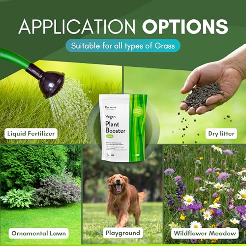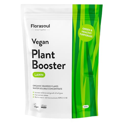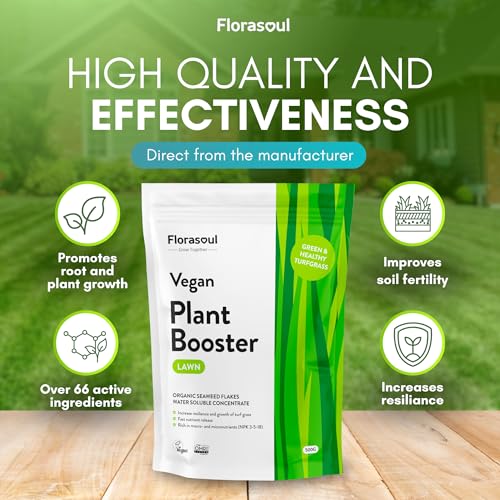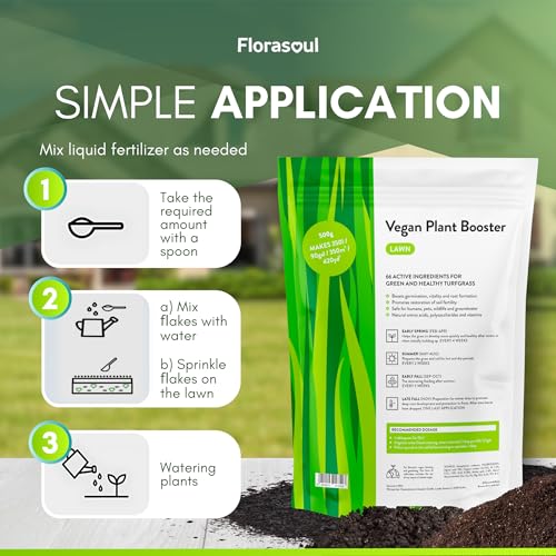 Florasoul® Organische Gazonmeststof voor GROEN EN GEZOND EIGEN EIGEN RUIN Milieuvriendelijk, Duurzaam en Effectief, Organische Vegan Gecertificeerde Gazonmeststof, Oplosbaar in water 500g/350l/800m²