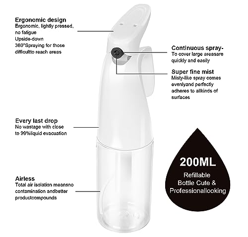 【360 graden haarsprayflessen】 De doorlopende spuitfles maakt 360 graden spuiten mogelijk op moeilijk bereikbare plaatsen. Je kunt het zelfs zijwaarts en ondersteboven gebruiken zonder lekkage of verlies van priem, dus alle gebieden kunnen worden bereikt, zodat je zelfs de laatste druppel vloeistof kunt gebruiken.