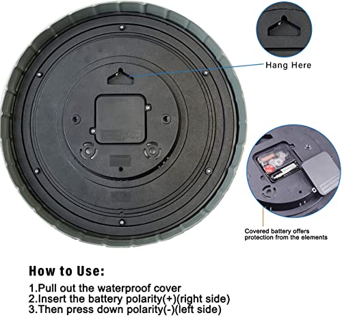 Waterdichte indoor outdoor klok: de hangende wandklok met uitstekende weerbestendige functie, kan goed werken bij zwaar weer. Ontworpen om zowel binnen als buiten te werken en is gemaakt om weerbestendig te zijn, of het nu regen, sneeuw, ijzel of zon is! De klok is ontworpen met kwartsuurwerk en garandeert een nauwkeurige tijdmeting. Waterdichte achterklep en rubberen afdichtingsklok aan de voorkant is ideaal voor montage aan zwembad, terras, tuin, garage, tuin, boerderij, zwembad, keuken, slaapkamer of badkamer.