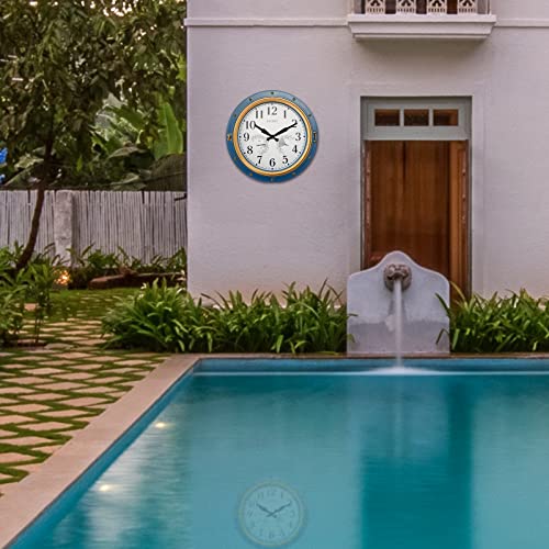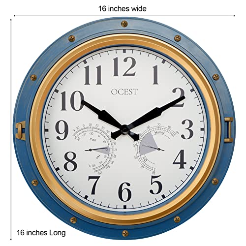 OCEST Tuinklokken van 16 inch voor buiten, waterdicht, grote thermometer, hygrometer, retro ontwerp, niet-tikkend, werkt op batterijen voor huisdecoratie, terras (blauw)
