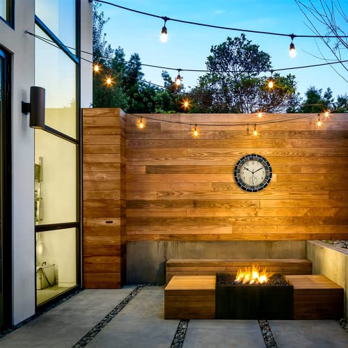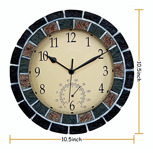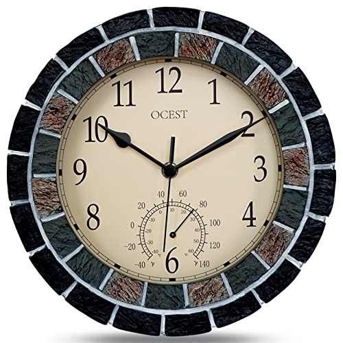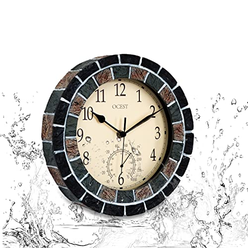 OCEST Tuinklokken van 25 cm voor buiten, waterdicht, thermometer, stil, niet-tikkend, batterij-aangedreven wandklokken, retro decoratieve klokken voor zwembad, keuken, terras