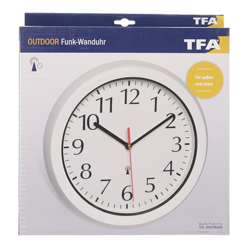 TFA Dostmann analoge zendergestuurde wandklok, 60.3542.02, voor binnen en buiten, spatwaterdicht, wijzerplaat met groot cijfers, frame kunststof, afdekking uit glas, wit, (L) 305 x (B) 56 x (H) 305 mm