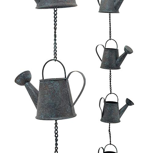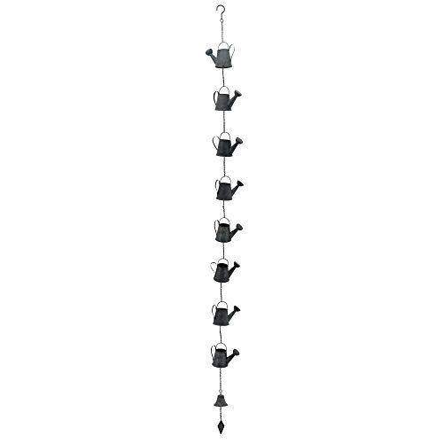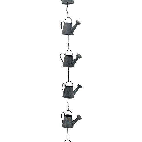 Genieten van de regen en geluiden van vallend water wordt aangenaam gemaakt met deze regenketting met gieters van Arcadia Garden Products. Of je nu de grillige ketting gebruikt als vervanging voor regenpijpen of als verticale waterpartij, deze regenketting is functioneel en mooi om in actie te bekijken. Regenkettingen worden gebruikt om afvoerwater van het dak uit de goten te leiden, waardoor de stroom van de fundering van het gebouw kan worden afgeleid. Al eeuwenlang worden regenkettingen in Japan op deze manier gebruikt en dienen ze ook als decoratief maar werkend accessoire voor het opvangen van regenwater. Tuinders installeren vaak regenkettingen en plaatsen waterdichte urnen of regentonnen eronder. Ontworpen om gemakkelijk op te hangen, kan deze regenketting zonder goten worden gebruikt door hem op de belangrijkste afvoerpunten te plaatsen om het neervallende water af te leiden. Sommige mensen laten de regenkettingen achter tijdens strenge winters om te genieten van wat een ketting van ijssculpturen wordt. De ketting meet 6,5 voet en bevat 8 vintage ogende gieter versieringen. Met een enkele bel aan de onderkant en een gegalvaniseerde afwerking, is deze metalen regenketting een heerlijk cadeau voor een tuinman of nieuwe huiseigenaar.