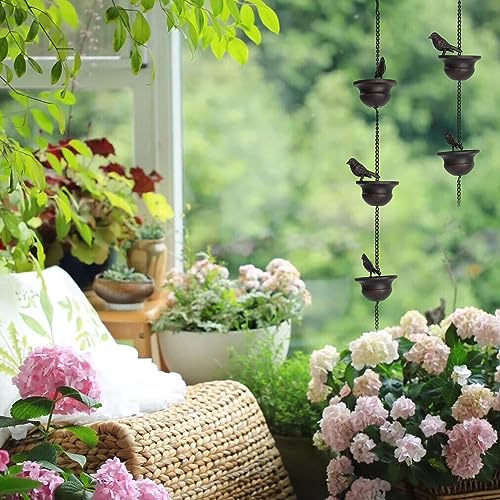 De regenkettingen hebben een prachtig ontwerp met 8 vogelbaden die elegant aan elkaar hangen in een trapsgewijs patroon. De regenketting wordt geleverd met beweegbare haken, zodat u kunt kiezen waar u hem naar wens wilt ophangen, waardoor het gemakkelijk is om een unieke en gepersonaliseerde look voor uw tuin te creëren. Gemaakt van hoogwaardig metaalmateriaal, bestand tegen alle weersomstandigheden. Roestbescherming zorgt ervoor dat ze er jarenlang geweldig uitzien en blijven.