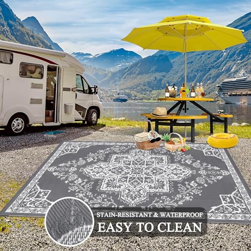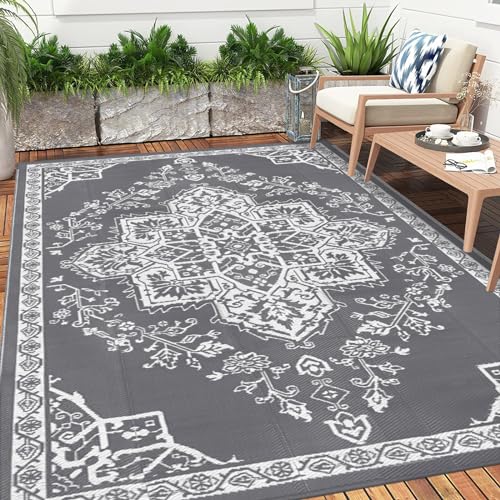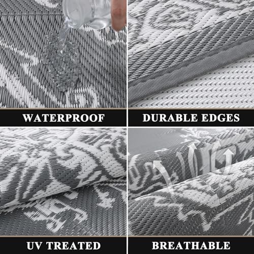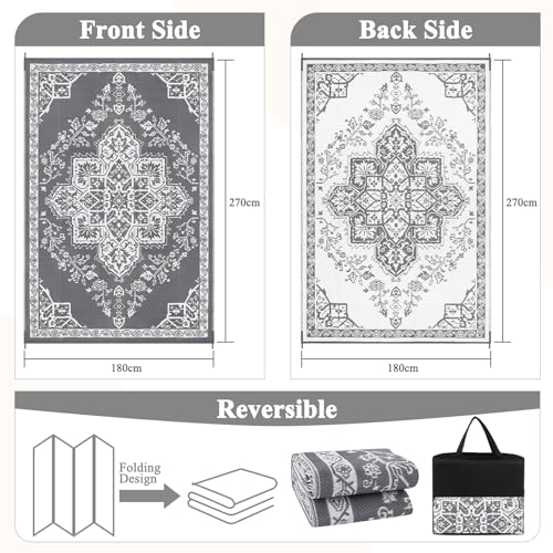 Enyhom Groot picknicktapijt voor buiten, gerecycled, UV-bestendig, waterdicht, duurzaam, stro-strandmat, veel verkeer, opvouwbaar, buitentapijt voor terras, tuin, dek (grijs, 180 x 270 cm)