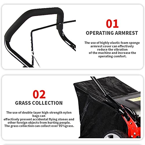 [Flexible and agile]: This gas powered lawn mower has 13inch rear wheels for easy maneuverability, plus a large capacity 60L bag for collecting clippings and a labour-saving design that will help you work more efficiently.