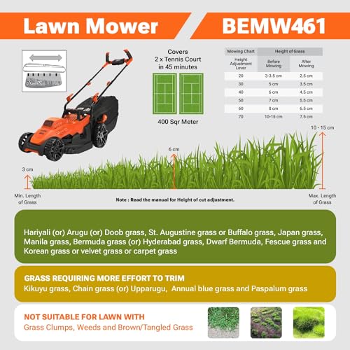 De elektrische grasmaaier BLACK+DECKER 1400 W 34 cm met fietsgreep is ontworpen om compact en licht te zijn en biedt optimale controle en manoeuvreerbaarheid. Het ergonomische ontwerp van de fietsgreep zorgt voor een gelijkmatige gewichtsverdeling en meer comfort bij het gebruik. Het hoogwaardige lemmet biedt 80% betere grasvanghoeveelheid en verbetert de meetresultaten aanzienlijk. Een grote opvangbak van 40 l maakt het mogelijk om het maaien te voeden zonder de frustratie van het continu legen van de container. De weergave van de complete box waarschuwt je wanneer het tijd is om te legen. Met een verbeterd wielontwerp voor betere grip en controle, een geïntegreerde draaggreep en 6 in hoogte verstelbare instellingen biedt deze grasmaaier alles wat je voor een onberispelijke tuin nodig hebt.