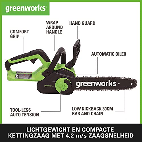 Greenworks G40CS30IIK2 Accu Kettingzaag, 30 cm Zaagblad Lengte, 4,2 m/s Kettingsnelheid, 2.6 kg, Automatische Oliesmering, 40V 2Ah Accu & Lader
