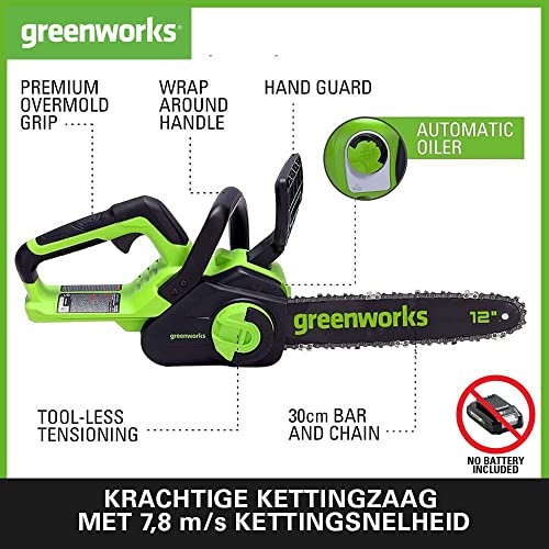 Greenworks GD24CS30 Accu Kettingzaag met Borstelloze Motor, 30 cm Zaagbladlengte, 7,8 m/s Kettingsnelheid, Automatische Oliesmering, Terugslagbeveiliging ZONDER 24V Accu & Lader