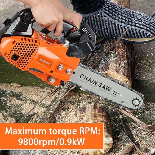 25,4cc gaskettingzaag: Gaskettingzaag uitgerust met een 25,4 CC motor, de maximale snelheid tot 9800 tpm levert stabiel vermogen aan de zaagketting en lage terugslagketting, ook lagere emissies en brandstofverbruik, wat zorgt voor een sterk snijdende prestatie