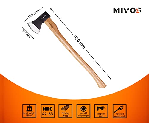 Mivos Bosbijl 1600 g met hickory-houten steel en lemmet van koolstofstaal – lengte 83 cm – universele bijl voor het bewerken van hout – kloofbijl met gelakt houten handvat voor tuin en bos
