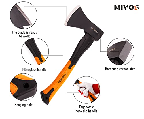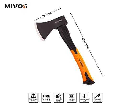 Mivos Kleine bijl, 800 g, met glasvezel handvat en lemmet van koolstofstaal, handbijl voor tuin en bos, universele bijl met rubberen greep