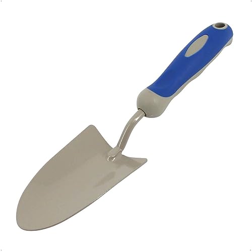 Rekord bloemschep, staal, blauw met rubberen kunststof handgreep, totale lengte: 34 cm, afmetingen lemmet: 13,5 x 8 cm, met ophanggat, handschep, bloemenschep, tuintroffel