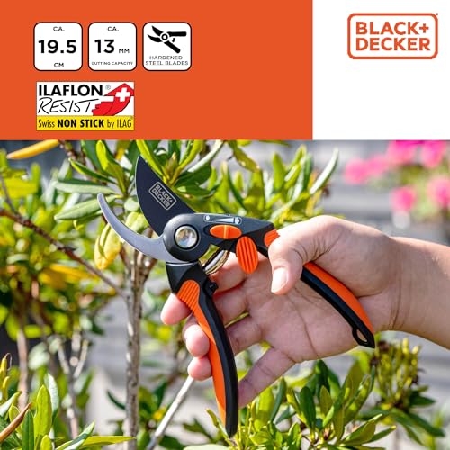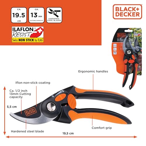 BLACK+DECKER Bypass Tuinschaar, hoogwaardige stalen messen, takkenschaar, ergonomische handgreep, boomschaar met snijcapaciteit van 13 mm, zwart/oranje