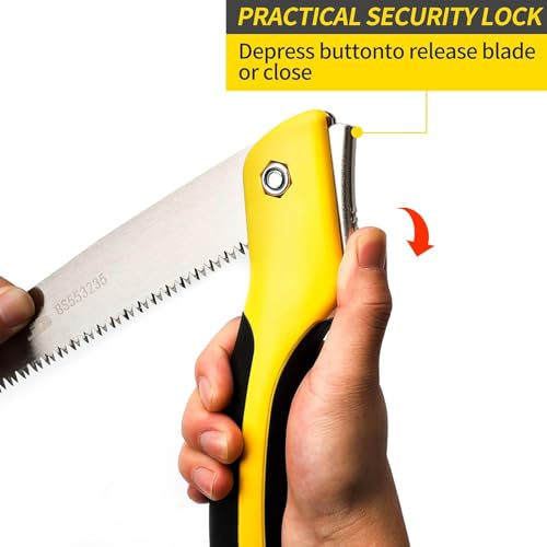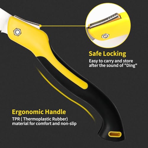 Vergrendeling ter voorkoming van letsels: de takkenzaag kan eenvoudig met een vergrendeling worden geopend en gesloten. De handgreep fungeert als schede en de vergrendeling op het handvat voorkomt dat het omklappert wanneer deze niet in gebruik is. Een geweldig tuingereedschap.