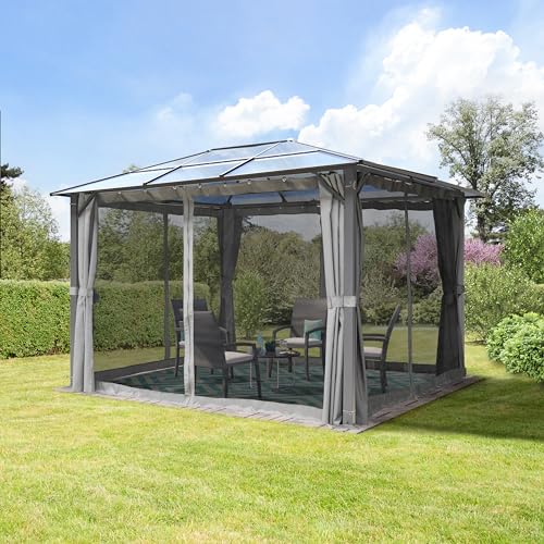 TOOLPORT Tuinpaviljoen 3×3,65 m polycarbonaat dak ca. 6 mm – Hardtop paviljoen met 4 zijwanden en 4 muggennetten in grijs