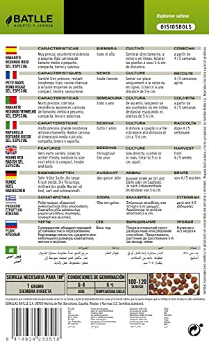 Zeer vroege soort, speciaal voor de markt met uitstekende doorgangsbestendigheid. Vleeswortel van middelgrote tot klein, compact, zacht en smaakvast. Geschikt voor het hele jaar door oogsten: kan het hele jaar door worden gezoomd, alleen van zitje, vliegen of in lijnen. Scheiding. Gelijkmatige verdeling van het zaad. 5-6 cm uitspoelen. Verwijdering. Collectie: ca. 30 dagen na het zaaien. Nettogewicht: 15 g. Geen zaden in elke envelop: 1800 Rebanus sativus is een plant van het kruisige gezin, die door zijn eetbare wortels wordt geteeld. Het is een zeer eenvoudige en snelle montage. Om de 30 dagen kunnen wij goed opgeleid en klaar om te eten. Het heeft verschillende vormen (rond, mediolarg en lang) en kleuren (wit, rood, roze met witte punt enz.). Er zijn twee ondersoorten van de satijvus, het rebaniet en de Longipinnatus is, de Japanse of daikonsoort is. Zeer populair in salades vanwege zijn kleurrijke en karakteristieke smaak. Algemene tips voor de kroonkurk van Rebanten omdat het een soort snelle groei is en de productie van kleine planten gaat, is de fase van het zaaien. Gebruik een groot aantal zaaien aan. Voor het zaaien van herfst en voorjaar zijn bijna alle soorten aanbevolen, omdat het de eenvoudigste kweektijd is. Voor het winterzaad geschikte soorten voor korte dagen en zomerzaad, late soorten en compacte wortels. De structuur van het perceel moet licht of open zijn en een goede vruchtbaarheid zijn. Kies een goede plaats van het perceel afhankelijk van het seizoen. In de winter worden het zaaien onder kunststof of op welke manier beschermd. In de lente en herfst kun je overal doen, maar in de zomer wordt het aanbevolen om op schaduwachtige en koele plaatsen te zagen. Zaaien met zaad. Het is omslachtiger dan zaaien, maar voorkomt dat de neus met de