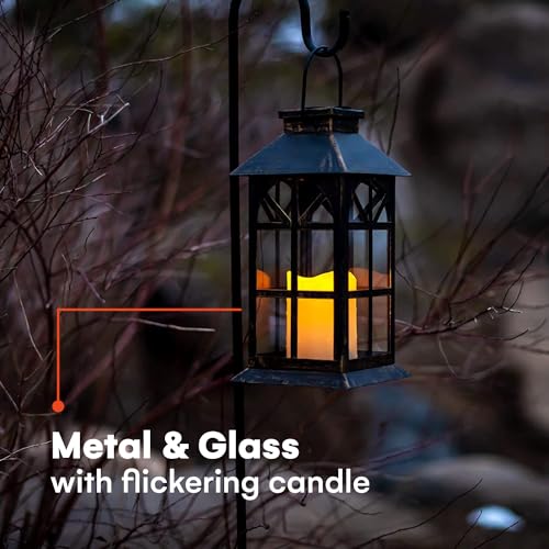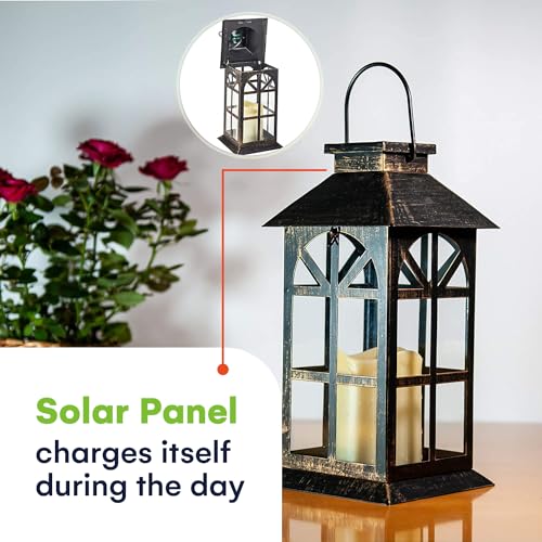 Solar Garden Lantern met Classic Bronze Antique Metal en PVC Construction – Indoor of Outdoor Hangende lantaarn of tafelblad op zonne-energie – Lantaarn op zonne-energie met LED-flikkerende kaars