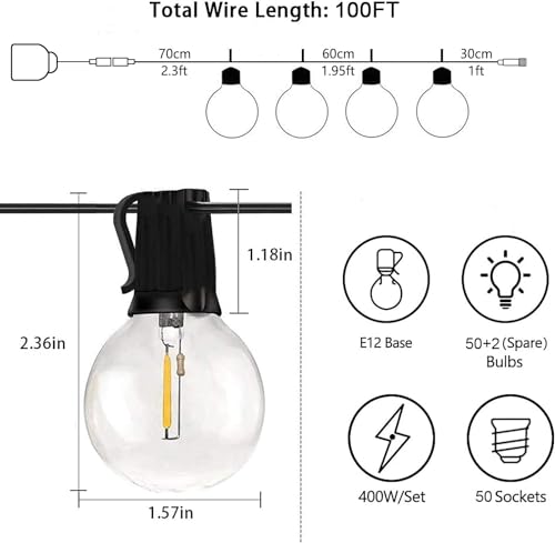 ✅【End-to-end chaining】Deze string met de lengte van G40 globe home garden patio lichtslingers is 30M/100FT. 55.5cm/21.85 inch afstand tussen per G40 Ledlampen, de eerste lamp is 3 meter verwijderd van de lamp stekker en de laatste lamp is 0,3 meter verwijderd van de interface, per snaar kunnen afzonderlijk of in serie worden gebruikt en kunnen tot 8 strings, niet meer dan 400W (50W x 8), genoeg om aan uw gebruiksbehoeften in de meeste potentiële toepassingen te voldoen.