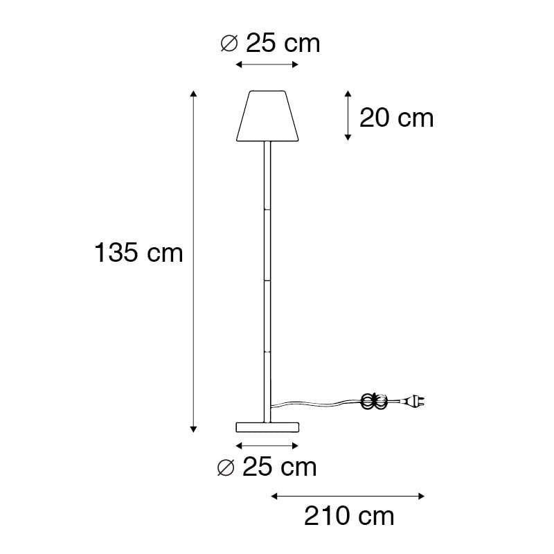 Wij zijn helemaal fan van deze buiten vloerlamp Virginia! Juist doordat de lamp eruit ziet als een vloerlamp voor binnen. De lamp is gemaakt van staal met kunststof en aluminium. Virginia heeft een diameter van 25 cm en een hoogte van 135 cm. Dit artikel wordt met snoer (210 cm) en stekker geleverd. Om Virginia compleet te maken zorg je zelf voor een lichtbron met E27 fitting (max. 23 Watt). De lamp is dimbaar met een externe dimmer, deze is niet inbegrepen. Virginia heeft een IP waarde van IP65, dat wil zeggen dat hij spuitwaterdicht is. Dat had je vast niet verwacht van deze buiten vloerlamp. Door zijn moderne uitstraling is het een tijdloze lamp, altijd een goede keuze in de tuin of bij het terras.