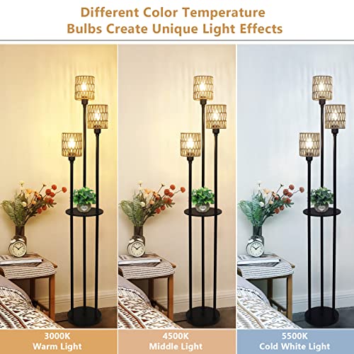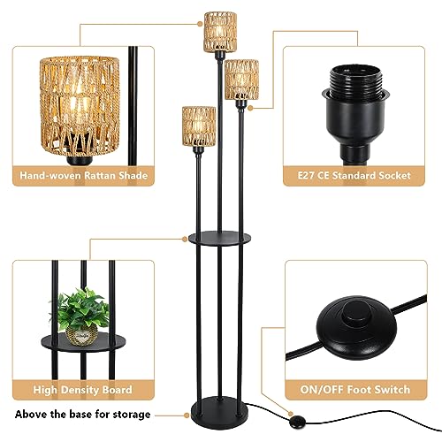 Rayofly rotan vloerlamp woonkamer, boho vloerlamp met plank, 3-lichts vintage vloerlamp met rotan lampenkap & voetschakelaar, industriële vloerlamp voor slaapkamer kinderkamer kantoor, hoogte 168cm