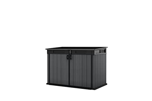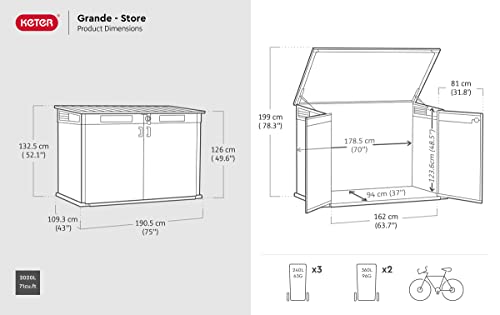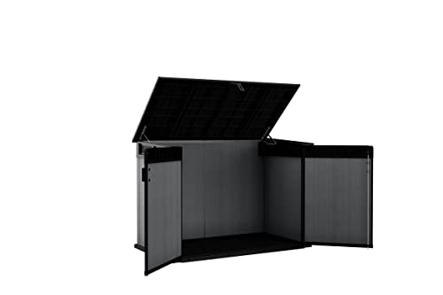 Deze buitenbox in zeer esthetisch design beschikt over een grote opbergruimte van 2020 liter. Het UV-behandelde polypropyleen materiaal geeft hem een houtlook volgens EVOTECH-technologie. Deze koffer is zeer duurzaam en stijf dankzij een metalen verstevigingsstructuur. Een ventilatierooster zorgt voor een luchtverversing en beperkt het fenomeen van condensatie. Praktisch, het vereist geen onderhoud. De deuren zijn afsluitbaar om je gereedschap en accessoires vast te zetten (slot niet inbegrepen). De kist is bestand tegen kou, hitte en alle weersomstandigheden. Het kan worden geverfd voor meer personalisatie. Het dak draagt tot 150 kg/m². De meegeleverde bodem beschermt je voorwerpen tegen vocht en modder. De schuine drempel vergemakkelijkt het opbergen van voorwerpen met wielen. Deze schuur wordt geleverd met kettingen voor het vasthouden van het vuilnisdeksel. Afmetingen: 190,5 x 109,3 x 132,5 cm.