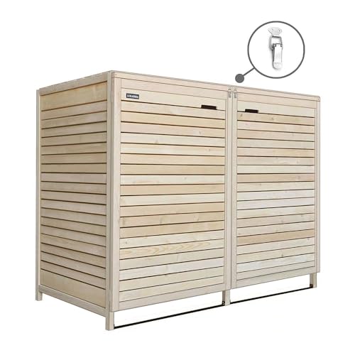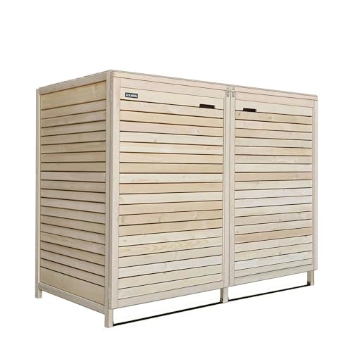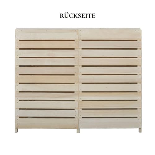 Door het moderne design kun je je ruimte voor de vuilnisbakken individueel vormgeven. In plaats van gekleurde tonnen willen wij je een praktische en esthetisch aantrekkelijke oplossing in je voortuin of poortoprit bieden. Onze vuilnisbakken van grenenhout bieden veel ruimte om het ontwerp aan te passen aan de huisgevel, waarin je deze in elke kleur kunt schilderen. Direct leverbaar, verzending vindt plaats vanuit Duitsland met factuur incl. BTW. Bij eventuele retourzending alleen de originele verpakking gebruiken, omdat deze afmetingen bij verzending niet mogen worden overschreden. Voor het hout: Hout is een natuurproduct en het leeft. Elke boom is uniek en hout is een tijdloos natuurproduct, dat door fysieke basiswetten zoals temperatuur en luchtvochtigheid wordt beïnvloed. Dit natuurlijke en rustieke karakter, dat de bijzondere charme van hout vormt, beperkt echter ook bepaalde beperkingen in de aard van de producten, die bewust in de aankoop moeten worden genomen. Ondanks de zorgvuldige materiaalkeuze en de modernste productiemethoden moeten bij hout de weergegeven bijzonderheden, die in de praktijk steeds weer te zien zijn, worden geaccepteerd. Deze kenmerken zijn onbeïnvloedbare eigenschappen van het materiaal hout. Groeit, kleur, structuur en nerf zijn uniek bij elke boom. Afwijkingen zijn afhankelijk van het hout en vormen geen reden voor klachten. Ook bij het eindproduct is minimale waxen, duimen of kromtrekken mogelijk. Scheuren en verwerpen van het hout zijn weinig te beïnvloeden, omdat deze een natuurlijk proces van het hout zijn en niet kunnen worden vermeden. Regelmatig onderhoud is essentieel om zo lang mogelijk plezier te hebben van je houten product. Afhankelijk van de weersinvloeden is de vernieuwing van de eerste beschermende laag absoluut regelmatig te verkrijgen.