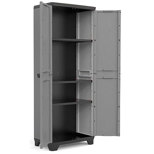 Uitvoering: 3 in hoogte verstelbare planken met elk 10 kg draagkracht (TÜV-gecertificeerd), in hoogte verstelbare poten voor hoogtecompensatie bij oneffen ondergrond, met een hangslot (niet meegeleverd) afsluitbare deuren, wandbevestiging voor een veilige stand