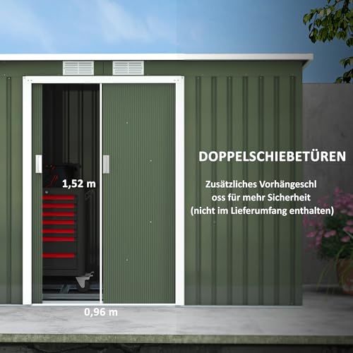 Outsunny gereedschapshuisje, tuinhuisje, gereedschapsschuur met schuifdeur, ventilatieraam, lessenaarsdak, buiten, staal, lichtgroen, 277 x 130 x 173 cm