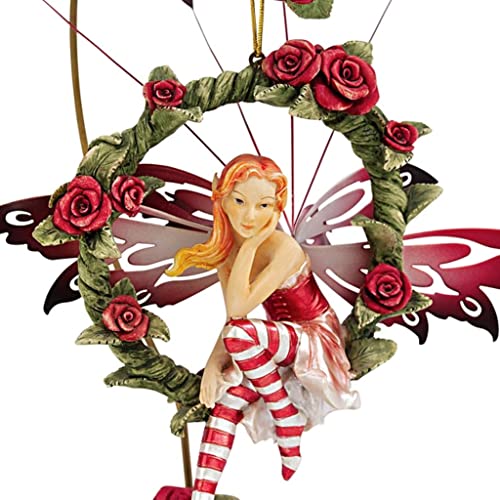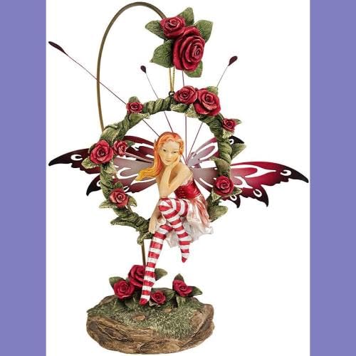 Stralende roos – Design Toscano’s zoete rozenfee heeft prachtig aardbeienblond haar, rood en wit gestripte kousen en een bloemblaadjesjurk; ze bungelt sierlijk aan de meegeleverde bijpassende standaard versierd met rozen