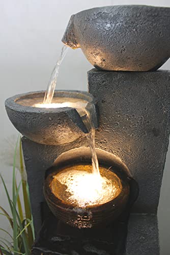 In de tuinfontein bevindt zich het waterbekken, dat ca. 30 liter water kan opnemen. In dit zwembad wordt ook de pomp geplaatst. Je kunt de fontein vrij neerzetten. Het water wordt met behulp van de pomp in de bovenste schaal gepompt, waar het vervolgens over de andere schalen en de cascadewand terug in het hoofdbekken stroomt.