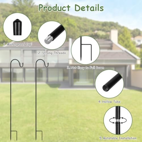 Breed toepassingsgebied: deze lantaarnstangen zijn perfect geschikt voor het ophangen van bloemenmanden, bloempotten, vogelhuisjes, insectenvallen, zonne-lampen, inmaakpotten, lantaarns, metalen spinners, kaarsenhouders, lichtkettingen, windgongen, muggenvallen, schietdienbladen en citroengras kaarsen en andere extra decoraties.