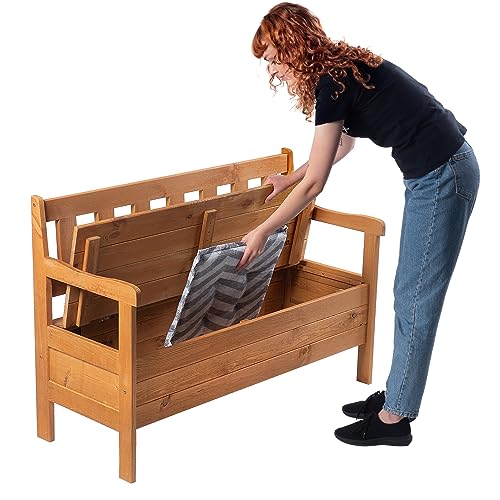 De tuinbank met vak combineert twee functies: een comfortabele zitbank en een opbergdoos. De volumineuze opbergruimte onder de bank zorgt voor orde op het terras of in de tuin. De bodem bestaat uit een robuuste en praktische houtvezelplaat. Je kunt er zonder problemen tuinaccessoires, aarde voor verplanten en dekens en speelgoed in bewaren.