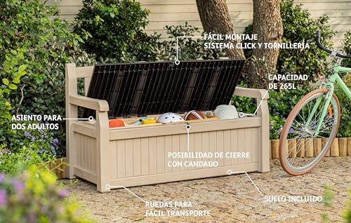 Keter Zitbank Eden voor balkon en tuin, tuinbank met geïntegreerde kussenbox met 265 l opbergruimte, 140 x 60 x 84 cm, weerbestendig, onderhoudsvriendelijk, beige, outdoor, houtlook