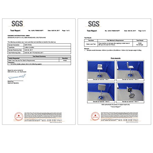 Een veilige bank: De auto-return-cilinder van de stoelen heeft de test van de SGS met betrekking tot “BIFMA X5.1” doorstaan (testnr.: AJHL1712004551FT; Rapport eigenaar: Leverant). De verchroomde stalen structuur en de brede basis (Ø 41 cm) maken bovendien belasting van 200 kg per barkruk mogelijk – maximale stabiliteit zelfs bij 360 graden rotatie