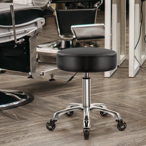 WKWKER Heavy Duty Rolling Kruk met Wielen Hydraulische Draaibare Verstelbare Rolling Stool Ergonomische Dikke Lederen Zitkruk Stoel Voor Keuken Opstellen Lab Kantoor Salon Berichtkruk – Zwart