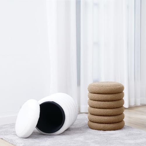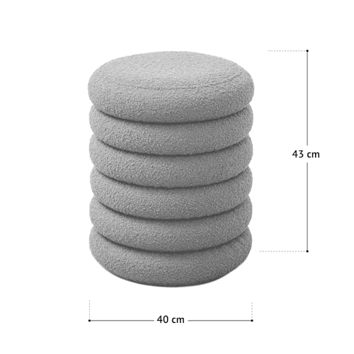 Multifunctioneel klein zitbankje: deze gestoffeerde poef met opbergruimte is ideaal als zitplek of kleine schoenenbank in de kleedkamer. Totale afmetingen: ongeveer 40 x 43 cm (diameter x hoogte).